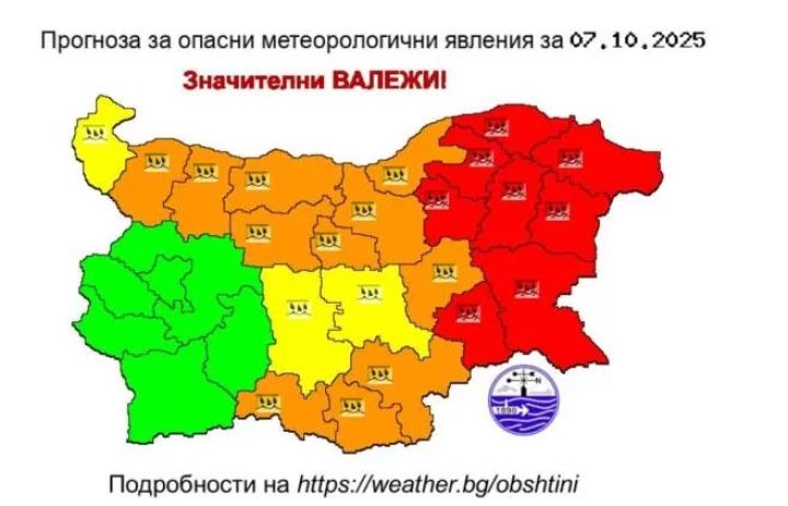 Националният институт по метеорология и хидрология издаде червен предупредителен код за значителни валежи за вторник – 7 октомври, в Източна България. Очакват се продължителни валежи и количества над 65 мм за 24 часа. Предупреждава се населението на област Разград да бъдат взети мерки за предпазване и действане според съветите на компетентните власти.