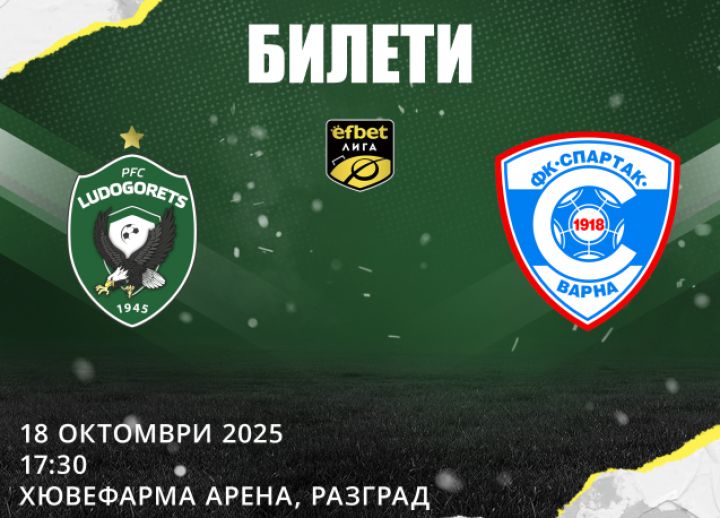 ПФК Лудогорец съобщава на своите фенове, че билетите за мача със Спартак (Вн) от XII кръг на efbet Лига вече са в продажба. Двубоят ще се играе на 18 октомври (събота) от 17:30 ч. на стадион „Хювефарма Арена“ в Разград.