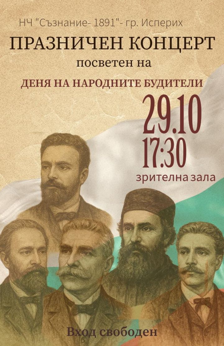 На 29 октомври (сряда) от 17:30 ч. в Зрителната зала на НЧ „Съзнание – 1891“ в град Исперих ще се проведе празничен концерт по случай Деня на народните будители.