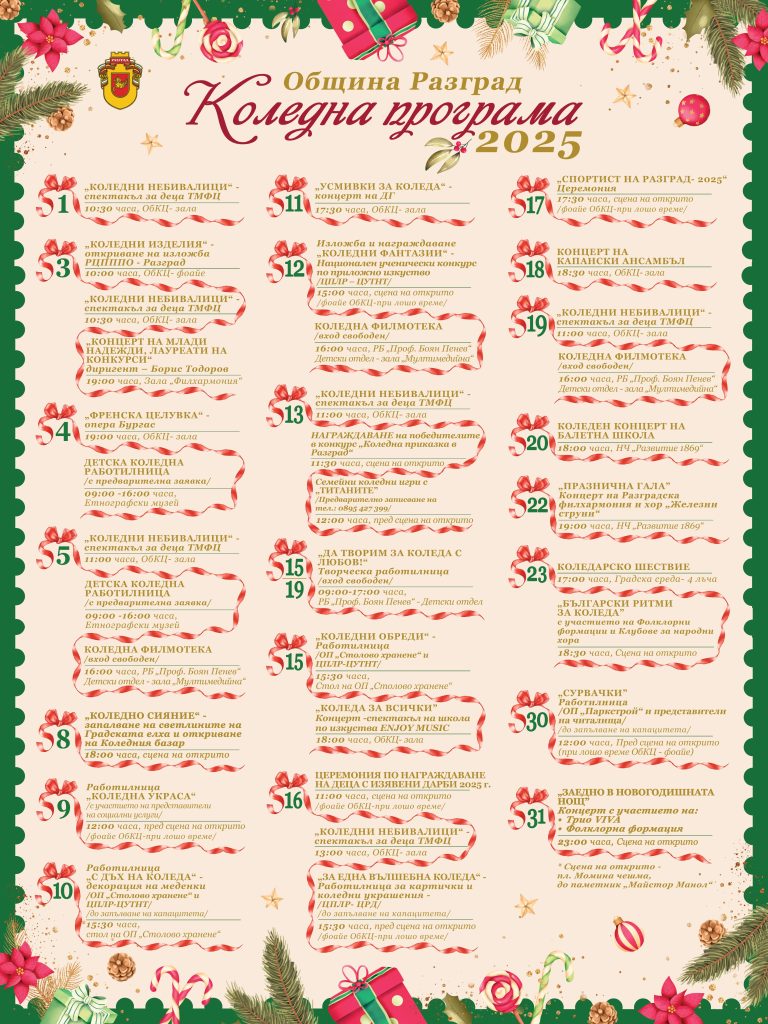Празнични концерти, работилници, изложби и специални инициативи, подготвени от културните институции и партньори на общината ще се случват през целия месец декември и ще допринасят за коледното настроение на жителите и гостите на Разград.
